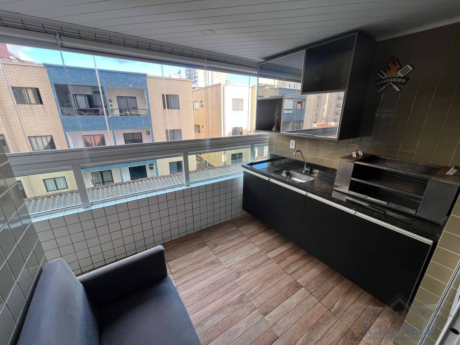 Varanda gourmet envidraçada, com churrasqueira e persianas